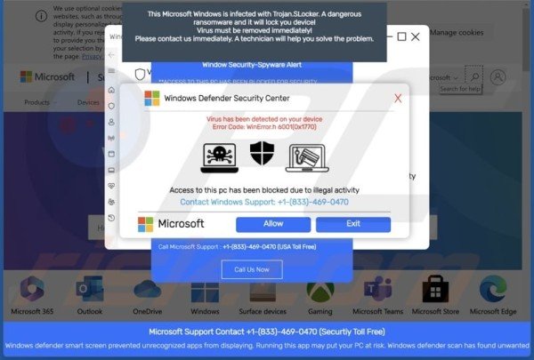 Pages de blocage : Une page s’affiche vous demandant d’appeler un numéro « Microsoft » pour débloquer votre PC (attention, c’est une arnaque !).